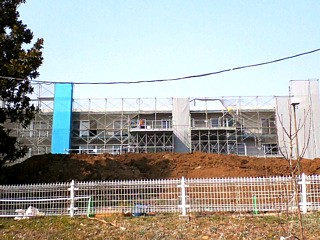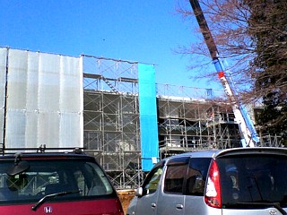 ▲合宿中にも工事は着々と進められ、ついに足場の大半が取れて建物全体がお目見えしました。日曜日でも工事の音が聞こえてきます(2007/3/25撮影) |