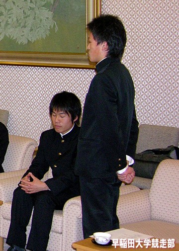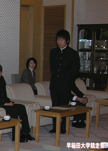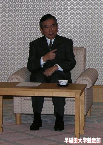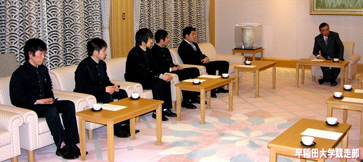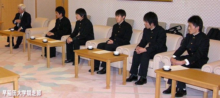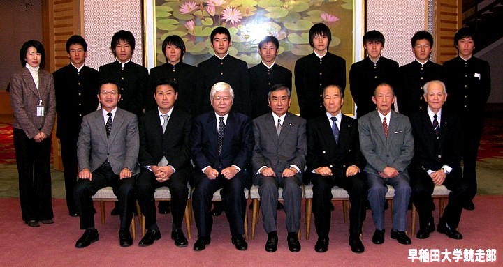 前列左から瀬古WAC理事・渡辺駅伝監督・野嶋部長・河野WAC会長・深沢WAC副会長・上木WAC副会長・中山WAC常務理事
