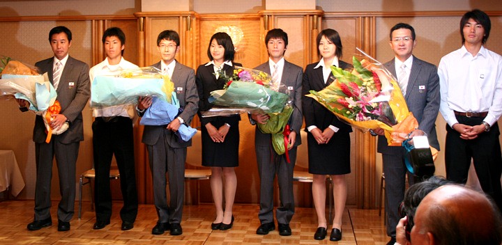 第29回オリンピック競技会(2008/北京)に出場する竹澤健介主将(4年)と佐藤敦之OB(平成13年卒・中国電力)、および日本チームの坂口泰コーチ(昭和59年卒・中国電力監督)、日本選手団役員の瀬古利彦JOC理事(昭和55年卒・エスビー食品)の壮行会が早稲田アスレチック倶楽部(WAC)と早稲田大学駅伝サポート倶楽部(WESC)の主催で行われました。