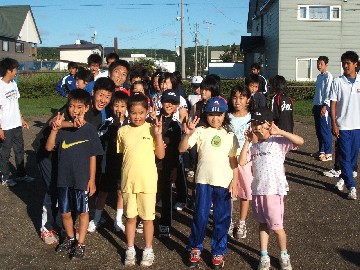 常呂町の小中学生との交流ランニング教室の風景(ただの記念撮影??)