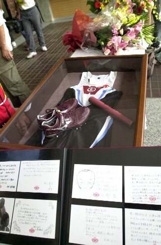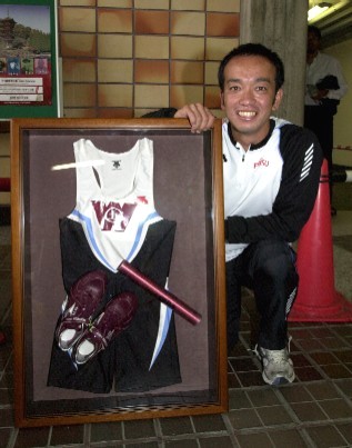 | ▲記念品は特注のユニフォーム、エンジのスパイク、 バトン、そして皆様からのメッセージカードです。 |