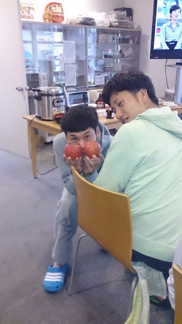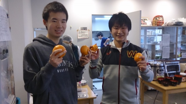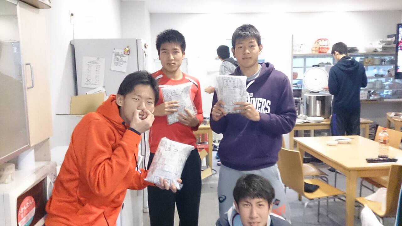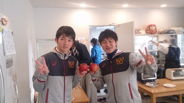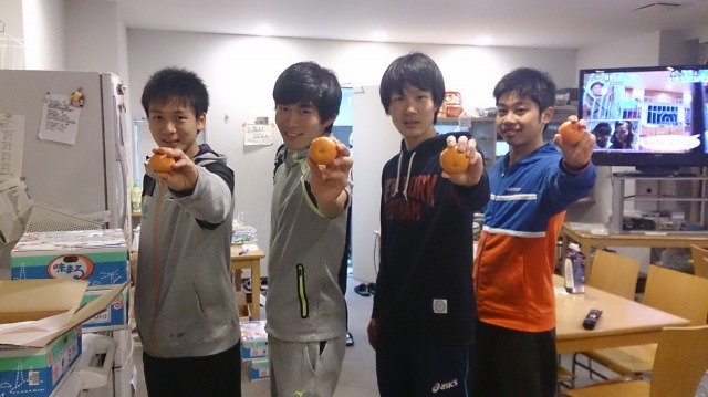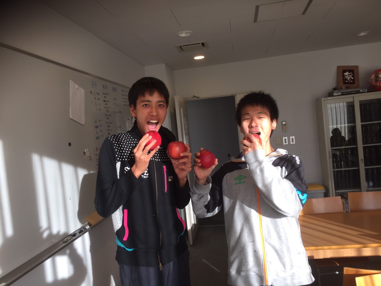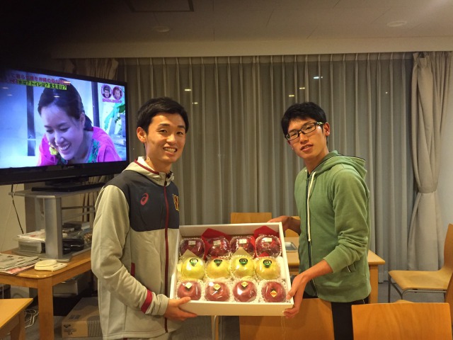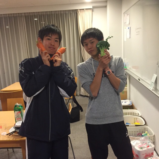 写真は左から長距離ブロック2年の石田と藤原です。普段から仲良しの2人が登場しましたが、朝だからか2人とも眠そうです(笑)石田に関しては寝癖まで付いています。頂いたグレープフルーツジュースでこの後爽やかな朝食を迎えたのでしょう。